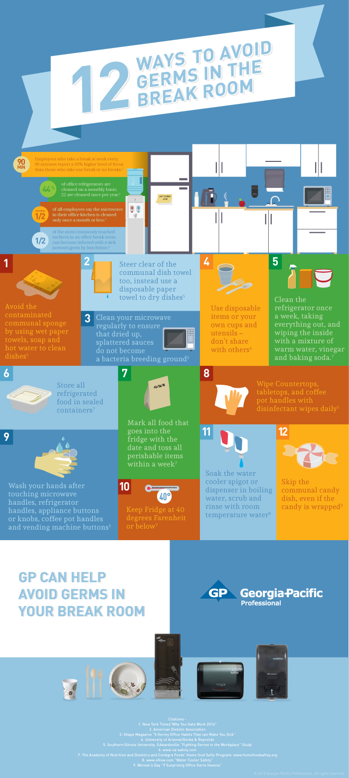 Is your break room making you sick? A closer look at this high-traffic area of your facility could reveal hot spots for germs and the potential spread of disease. Keep it clean! Georgia-Pacific has 12 ways to help avoid germs in your break room.