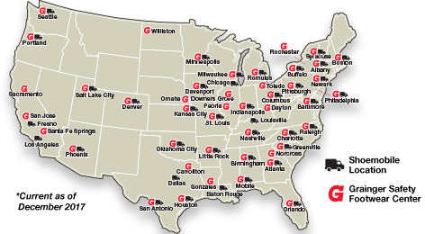 Administering a quality safety footwear program doesn’t have to be so hard. Let our Managed Footwear Program help handle the administrative work to ease the burden of managing your safety shoe program. See how Grainger can make your job a little easier, helping you save time and money. Outfit your crew in the latest footwear online or in a Grainger Safety Footwear Center in dozens of locations across the country. We even have Shoemobile trucks stocked with the latest footwear styles that come right to your door in select markets.